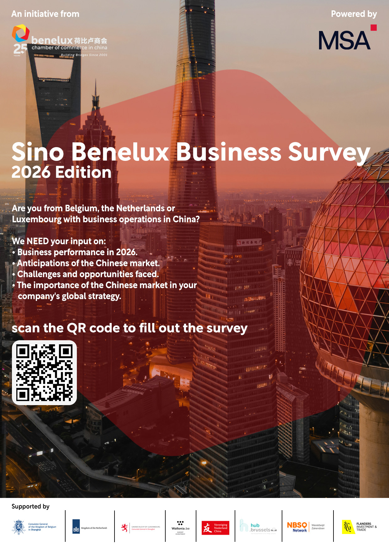 The SBBS is an initiative by the Benelux Chamber of Commerce in China, supported by MSA, which is conducted with the main aim of providing start-ups, SMEs and larger businesses with insight on the performance and expectations of Belgian, Dutch and Luxembourgish businesses in operating in China.