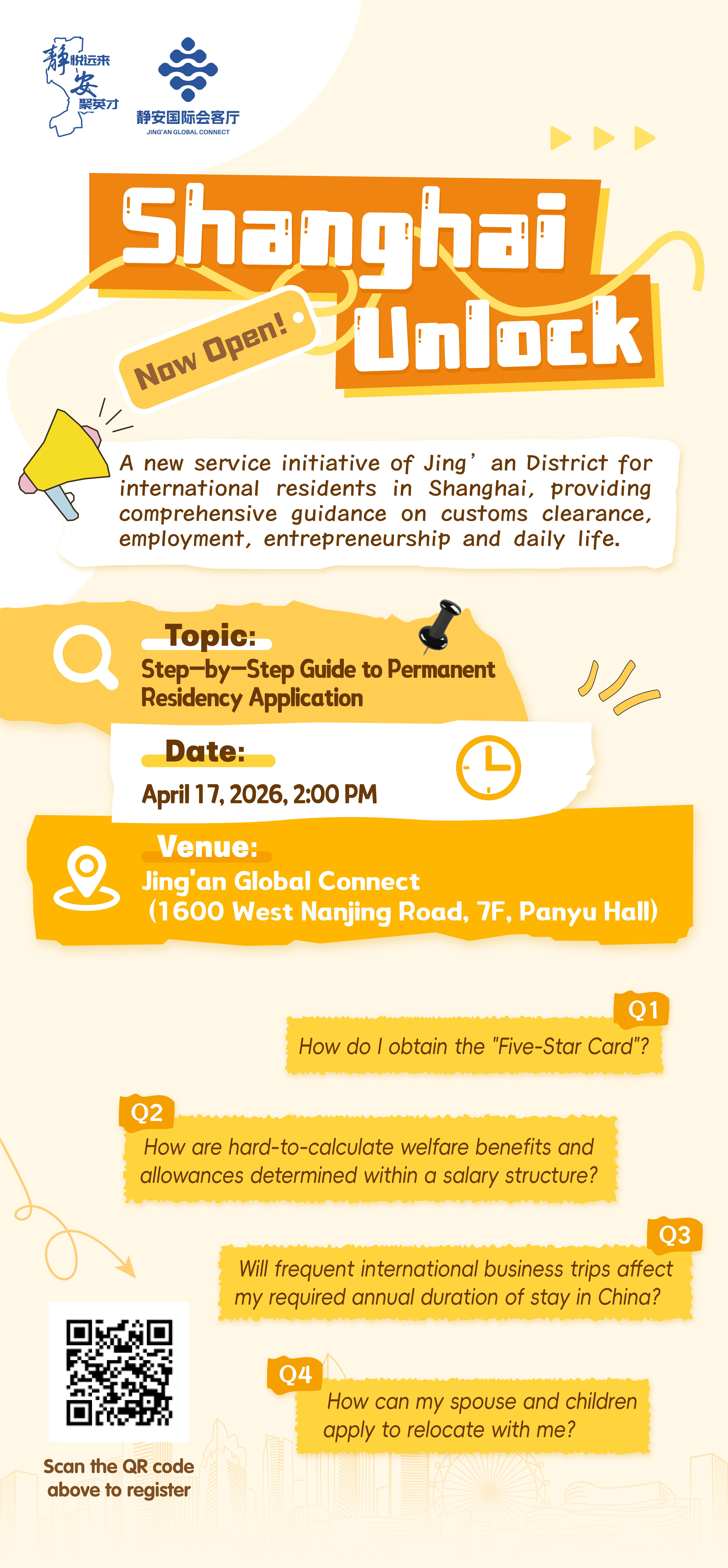 As part of this launch, an informational session will be held on April 17, 2026, at Jing’an Global Connect, focusing on the topic of permanent residency applications. The session will offer a step-by-step guide to obtaining permanent residency in China, addressing common concerns such as eligibility for the “Five-Star Card,” the calculation of salary-related benefits, and the impact of international travel on residency requirements.